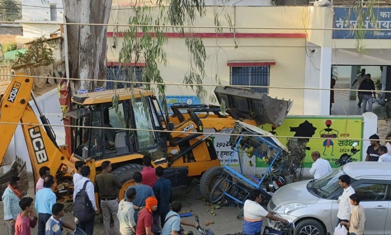 नगर पंचायत के सामने लापरवाह जेसीबी चालक ने हजारों रुपए के फल ठेले के ऊपर चढ़ाई जेसीबी
