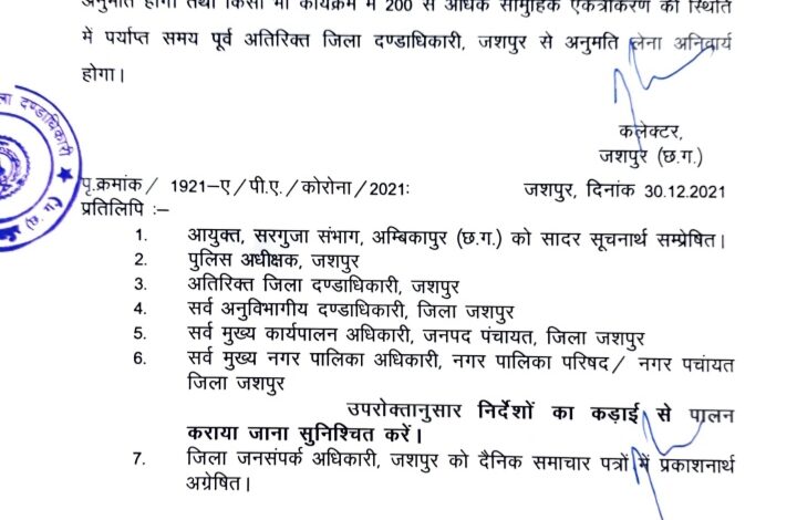 कोविड 19 और नये वेरियंट ओमीक्रान के नियंत्रण को लेकर जशपुर कलेक्टर का महत्वपूर्ण आदेश जारी,,