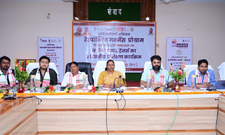 जशपुर में आदि कर्मयोगी अभियान के तहत रेस्पॉन्सिव गवर्नेंस कार्यक्रम के अंतर्गत 3 दिवसीय प्रशिक्षण कार्यक्रम का शुभारंभ शासन की योजनाओं का लाभ गांव के अंतिम व्यक्ति तक पहुंचाना हम सबकी जिम्मेदारी – गोमती साय