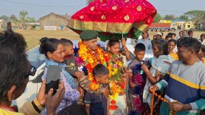 उनकी घर वापसी पर गांव में वर्षों से चली आ रही अनोखी परम्परा भी निभाई गई। गांव की सीमा न्यायालय के समीप पर पहुंचते ही ग्रामीणों ने स्वागत किया, महिलाओं ने स्वागत गीत ओर आरती’ उतारकर उनका सम्मान किया।