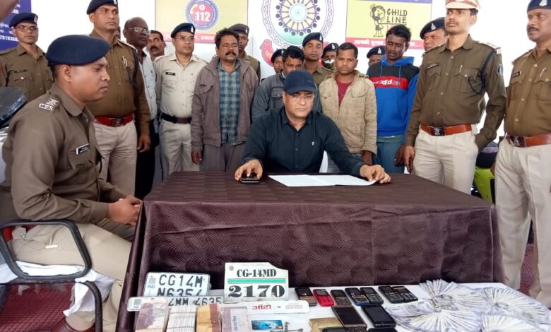 नकली सोना देकर लाखों रुपए की ठगी करने वाले चार आरोपी पुलिस गिरफ्त में जसपुर पुलिस अधीक्षक की निर्देश पर लगातार अपराधियों पर हो रही कार्यवाही चारों आरोपियों से नकली सोना, नकली पैसे, कई मोबाईल सेट कई सिम कार्ड, पांच नग मोटर सायकल, 40,000 रूपये नगद , सोने तौलने का तराजू व अन्य कई समाग्रीया जप्त की गई