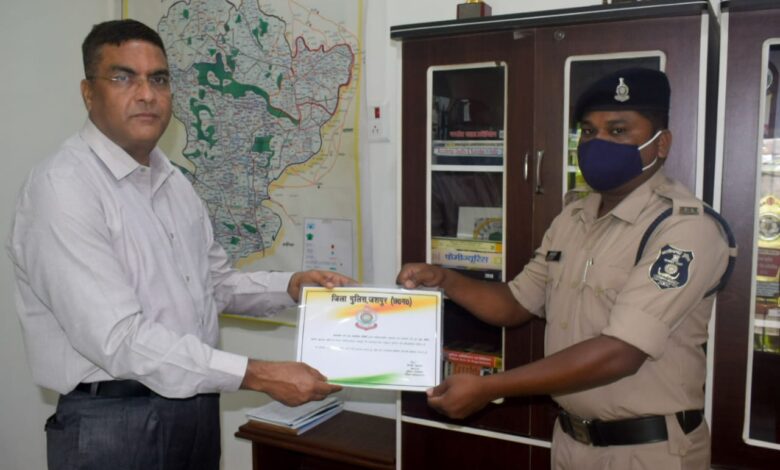 जशपुर पुलिस द्वारा विषम परिस्थिति में रक्तदान करने पर पुलिस अधीक्षक विजय अग्रवाल द्वारा सम्मानित करते हुये प्रशस्ति पत्र दिया