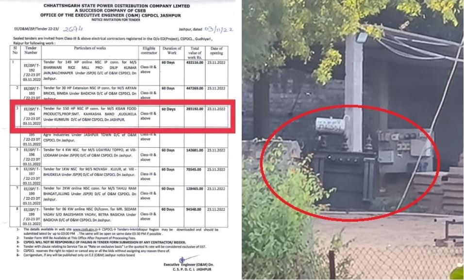 मामला है जशपुर जिले के कुनकुरी कुडुकेला का, जहां किसान फूड प्रोडक्ट्स, स्वामी- कहकशां बानो के फर्म में 150 एचपी का ट्रांसफार्मर व अन्य विद्युतीकरण का कार्य होना था, जिसके लिए जशपुर बिजली विभाग के द्वारा 03 नवम्बर को टेंडर आमंत्रित किया गया था। इस टेंडर के खुलने की तिथी 23 नवम्बर तय है। जबकि उक्त टेंडर खुलने की तिथी से पहले ही मौके पर ट्रांसफार्मर लग गया। जब मामले की भनक मीडिया को लगी तो आनन फानन में ट्रांसफार्मर उतरवा कर राइस मिल परिसर में ही रखवा दिया गया है। टेंडर खुलने से पहले ट्रांसफार्मर लगाने और उतारे जाने से अनियमितता स्पष्ट परिलक्षित हो रही है।