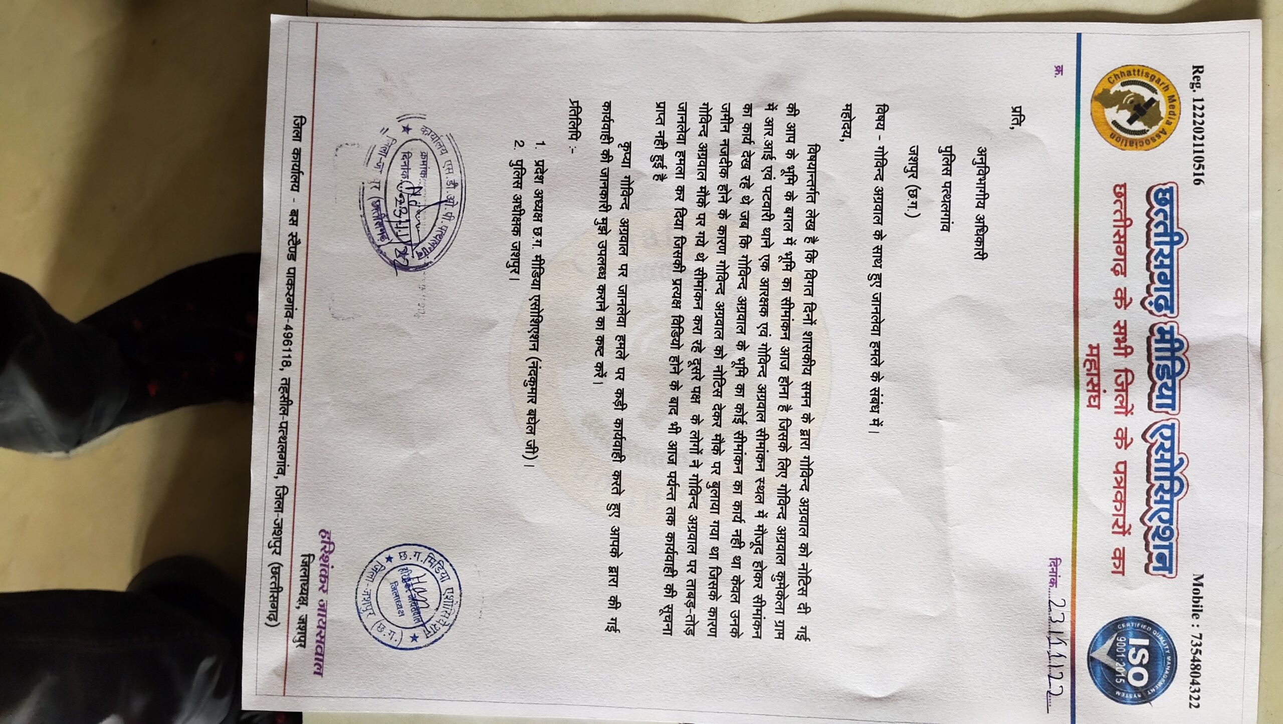 इस घटना को लेकर आज पर छत्तीसगढ़ मीडिया एसोसिएशन के जिला अध्यक्ष हरिशंकर जायसवाल ने पत्थलगांव एसडीओपी हरीश पाटिल को ज्ञापन सौंपते हुए कहा है कि यदि जल्द ही प्रेस क्लब के संरक्षक हरगोविंद अग्रवाल के आरोपियों के ऊपर कठोर कार्यवाही नहीं की जाती हैं तो उनके द्वारा प्रदेश स्तर पर आंदोलन करने की बात कही है। ज्ञापन सौंपने के दौरान एसडीओपी हरीश पाटिल ने जिला अध्यक्ष हरिशंकर जायसवाल को ठोस कार्यवाही का भरोसा दिलाया है।