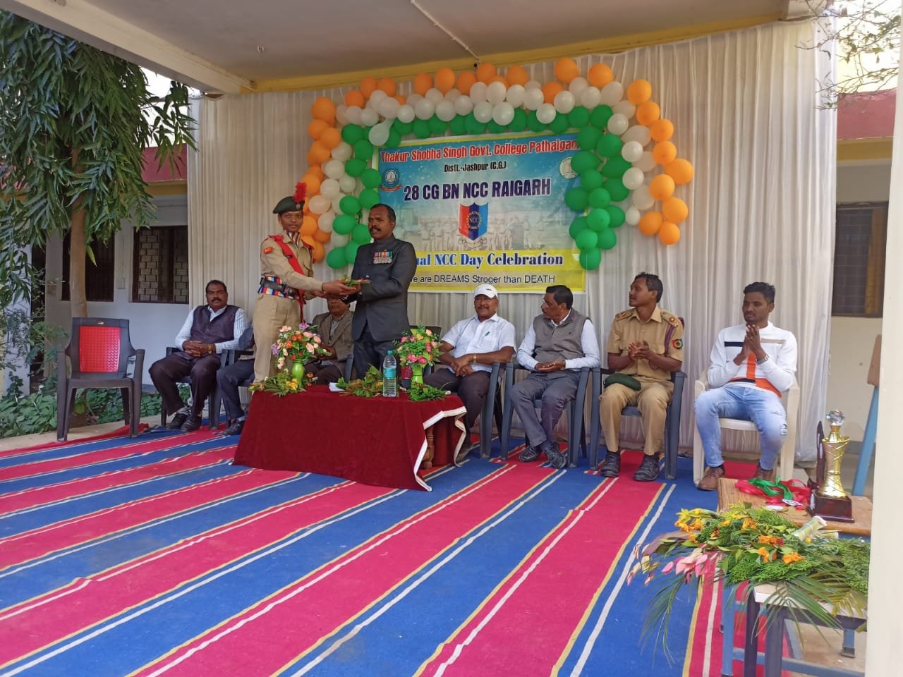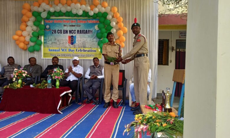 ठाकुर शोभा सिंह शासकीय महाविद्यालय पत्थलगांव में आज एन.सी.सी. की स्थापना के 74 वें वर्षगांठ पर कार्यक्रम आयोजन किया।विदित हो कि प्रति वर्ष नवंबर माह के आखिरी रविवार को एन.सी.सी. दिवस मनाया जाता है।इसी क्रम में आज महाविद्यालय परिसर में यह कार्यक्रम आयोजित किया गया ।शासकीय बालक उच्चतर माध्यमिक विद्यालय पत्थलगांव एवं महाविद्यालय के एनसीसी कैडेट्स द्वारा प्रातः 8:00 बजे एन.सी.सी. के झंडारोहण एवं परेड के साथ कार्यक्रम का शुरुआत किया गया।इस अवसर पर महाविद्यालय प्रांगण में मंचीय कार्यक्रम आयोजित कर रंगारंग सांस्कृतिक कार्यक्रम की प्रस्तुति दी गई |मंचीय कार्यक्रम में बतौर मुख्य अतिथि के रूप में सेवानिवृत्त फौजी अमरदास कुलदीप एवं विशिष्ट अतिथि के रूप में शासकीय बालक उच्चतर माध्यमिक विद्यालय पत्थलगांव के पूर्व एनसीसी अधिकारी बी. एस. पैंकरा वर्तमान थर्ड ऑफिसर डीडी किस्पोट्टा महाविद्यालय के पूर्व एन.सी.सी. अधिकारी डाॅ . एस. के. टोप्पो, एवं महाविद्यालय के वरिष्ठ प्राध्यापक डाँ. बी.के. राय उपस्थित रहे ।कार्यक्रम की अध्यक्षता महाविद्यालय के संरक्षक एवं प्राचार्य प्रो. डी. के. अंब्रेला ने की। अमर दास कुलदीप ने अपने ओजस्वी उद्बोधन से सेना में स्वयं की सेवा काल की विभिन्न अनुभव को साझा करते हुए एनसीसी कैडेट्स को देश सेवा, समर्पण, त्याग, अनुशासन का भाव को आत्मसात करके विद्या अध्ययन करने के लिए प्रेरित किया तथा देश की रक्षा के लिए सेना की भूमिका को स्पष्ट करते हुए बतलाया की सेना कोई नौकरी नहीं बल्कि देश सेवा के लिए सर्वस्व न्योछावर करने का भाव है, साथ ही उन्होंने बताया कि विद्यालयों एवं महाविद्यालयों में पढ़ने वाले विद्यार्थियों में एन.सी.सी. यूनिट के माध्यम से देश सेवा, समर्पण, त्याग, बलिदान , और अनुशासन का भाव पैदा होता है। इसलिए विद्यार्थियों को ऐसे अच्छे संस्कारों को ग्रहण करने के लिए हमेशा तत्पर रहना चाहिए ,और जब भी अवसर मिले तो उसमें अपनी सहभागिता निभाना चाहिए।महाविद्यालय के प्राचार्य अपनेअध्यक्षीय उद्बोधन में एन.सी.सी. के महत्व को स्पष्ट करते हुए कहा कि एन.सी.सी. को एक संस्कार के रूप में माना जाना चाहिए इसके माध्यम से ही युवाओं में त्याग तपस्या अनुशासन सहयोग जैसे विभिन्न मानवीय गुणों को सीखने का अवसर प्राप्त होता है, जो उनके व्यक्तित्व विकास में महत्वपूर्ण भूमिका निभाता है |उद्बोधन के क्रम में विशिष्ट अतिथि डॉ . एस. . के. टोप्पो ने महाविद्यालय में एन.सी.सी. अधिकारी के रूप में व्यतीत किये हुए पल को याद करते हुए बतलाया और एनसीसी कैडेट्सों को एनसीसी के ध्येय वाक्य त्याग, समर्पण ,और अनुशासन, को आत्मसात करते हुए आदर्श नागरिक निर्माण करने के लिए प्रेरित किया। सेवा निवृत्त फौजी श्री अम