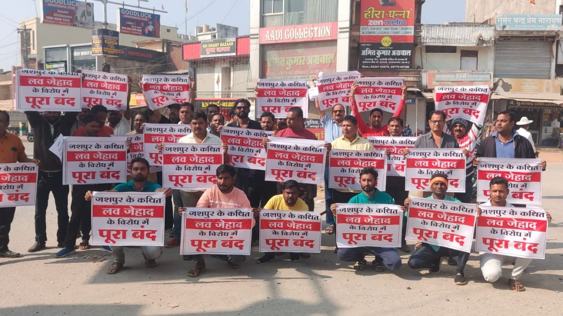 जसपुर में हिंदू युवती को अगवा कर मुस्लिम समाज के युवक द्वारा गायब कर दिए जाने के मामले को लेकर हिंदू समाज में आक्रोश देखा जा रहा है जशपुर जिले के पत्थलगांव में भी लोगों ने इसका विरोध प्रदर्शन करना शुरू कर दिया है यहां के इंदिरा चौक पर भारी संख्या में लोग एकत्रित होकर लव जिहाद के विरोध में नारा प्रदर्शन करते नजर आए आज सर्व हिंदू समाज के लोगों ने जसपुर जिला बंद का आह्वान किया है जिसके मद्देनजर जसपुर जिले में जगह जगह बंद नजर आ रहा है एवं बंद की तस्वीरें भी लगातार देखी जा रही है इसी तारतम्य में आज पत्थलगांव में भी सैकड़ों युवाओं का हुजूम मोटरसाइकिल पर रैली की शक्ल में लव जिहाद के विरोध में नारेबाजी करता हुआ इंदिरा चौक पर विरोध का इजहार किया हिंदू समाज के लोगों में इस मामले को लेकर काफी नाराजगी देखी गई पत्थलगांव पुलिस ने विरोध प्रदर्शन को देखते हुए भारी सुरक्षा व्यवस्था तैनात की गई है।