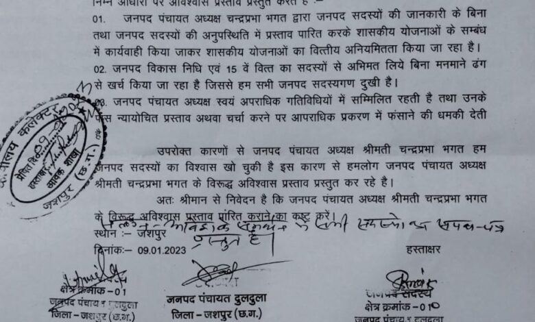 पत्र में उनका कहना है कि जनपद पंचायत सदस्यगण का जनपद पंचायत अध्यक्ष श्रीमती चन्द्रप्रभा भगत के प्रति विश्वास समाप्त हो गया है इसलिए हम अधोहस्ताक्षरित जनपद सदस्यगण, जनपद पंचायत अध्यक्ष चन्द्रप्रभा भगत के विरूद्ध निम्न आधारों पर अविश्वास प्रस्ताव प्रस्तुत करते है
