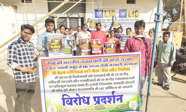 पत्थलगांव — केंद्र की भाजपा की मोदी सरकार के द्वारा अडानी समूह में एल आई सी और एस बी आई जैसे सरकारी संस्थाओं में बेहद जोखिम भरे लेनदेन और निवेश ने भारत के निवेशकों एलआईसी के करीब 25 करोड़ पॉलिसी धारकों और एसबीआई के करोड़ों खाता धारकों के जनजीवन पर विपरीत प्रभाव पड़ा है। युवा कांग्रेस ने मोदी सरकार पर आरोप लगाते हुए कहा है कि अपने चहेते उद्योगपति मित्रों को नियम विरुद्ध लाभ देते हुए देश के करोड़ों बैंक व भारतीय जीवन बीमा निगम के खाताधारकों का भविष्य खतरे में पड़ गया है। जिसे लेकर युवा कांग्रेस ने खाता धारकों के समर्थन में पत्थलगांव एल आई सी के बाहर पोस्टरों को हाथों में लेकर विरोध जताया।