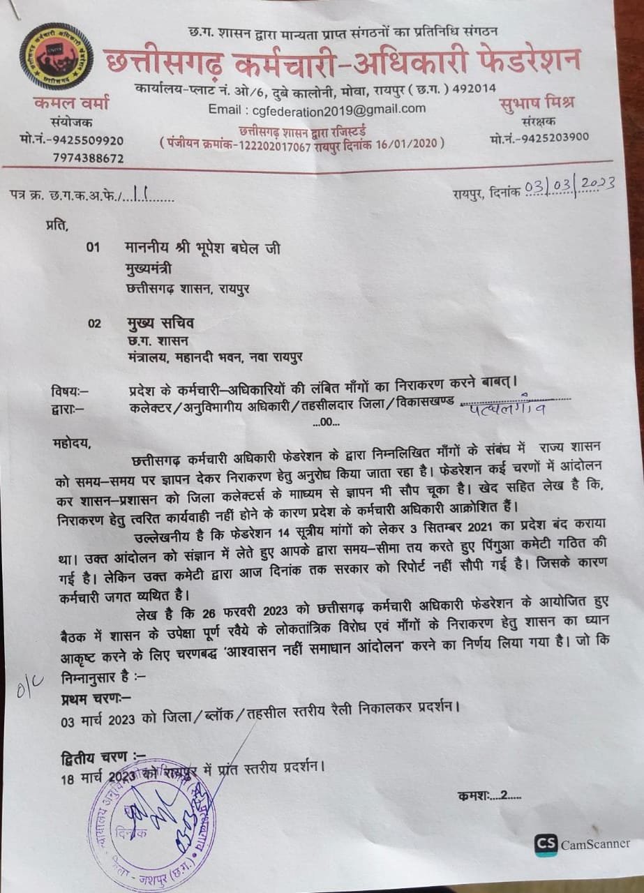 ज्ञात हो कि छत्तीसगढ़ कर्मचारी अधिकारी फेडरेशन द्वारा अपनी 14 सूत्रीय मांगों को लेकर 3 सितंबर 2021 को प्रदेश बंद कराया गया था आंदोलन को संज्ञान में लेते हुए मुख्यमंत्री महोदय जी ने समय सीमा तय करते हुए पिंगुवा कमेटी गठित की गई परंतु आज पर्यंत तक उक्त कमेटी द्वारा सरकार को रिपोर्ट नहीं सौंपी गई जिस कारण कर्मचारी जगत में रोष व्याप्त है इसी संबंध में 28 फरवरी 2023 को छत्तीसगढ़ कर्मचारी अधिकारी फेडरेशन द्वारा आयोजित बैठक में शासन के उपेक्षा पूर्ण रवैया को लोकतांत्रिक विरोध एवं मांगों को निराकृत करते हुए शासन का ध्यान आकृष्ट कराने के लिए ” *आश्वासन नहीं समाधान आंदोलन*” करने का निर्णय लिया गया है आंदोलन का प्रथम चरण में 3 मार्च 2023 को जिला ब्लाक तहसील स्तरीय अनुविभागीय अधिकारी को माननीय मुख्यमंत्री एवं मुख्य सचिव जी के नाम ज्ञापन सौंपना तथा द्वितीय चरण 18 मार्च 2023 को रायपुर में प्रांतीय प्रांत स्तरीय रैली का आयोजन किया गया है