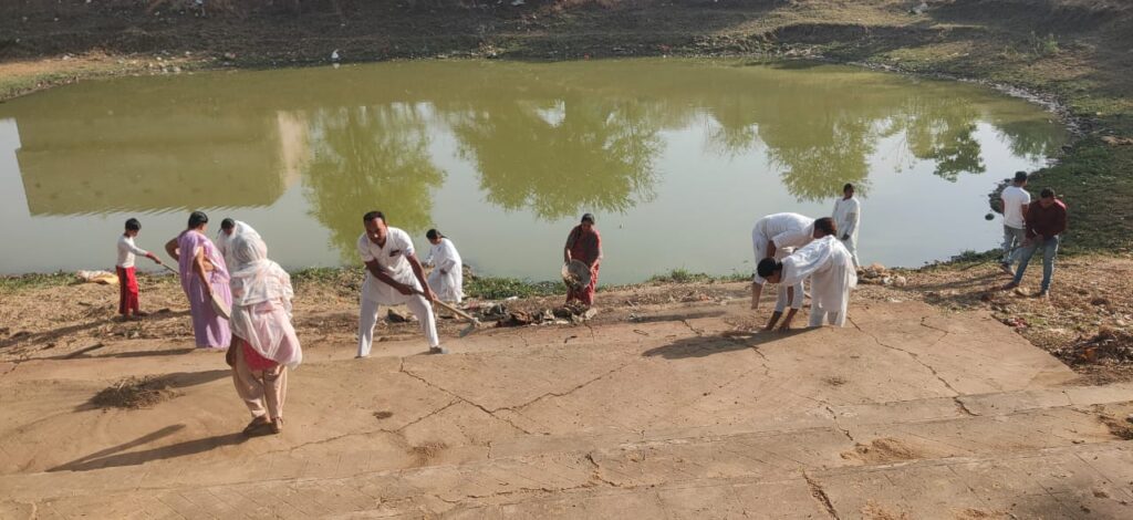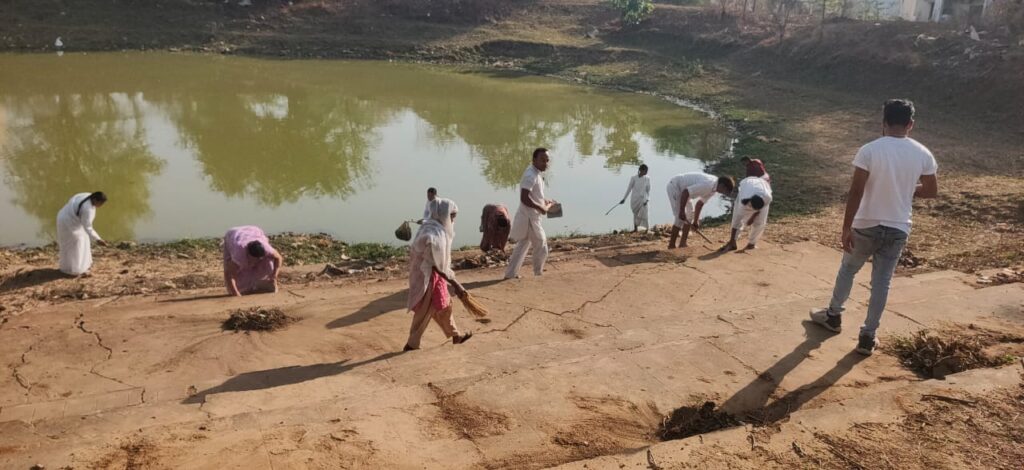 आज प्रजापिता ब्रह्मा कुमारी ईश्वरी विश्व विद्यालय के भाई बहनों ने पुरानी बस्ती में स्थित तालाब की साफ सफाई की ।सभी ने कंधे से कंधा मिलाकर फावड़ा और घमेले से कचरे को इकट्ठा कर फेंका एवं पूरे तालाब परिसर की साफ सफाई की आज के इस जल जीवन संरक्षण कार्यक्रम में पत्थलगांव में लंबे समय से स्वास्थ्य सेवा दे रहे डॉक्टर पी सुथार, के साथ एसडीएम रामशिला लाल एवं नगरपंचायत के सफ़ाई कर्मचारी भी मौजूद रहे।