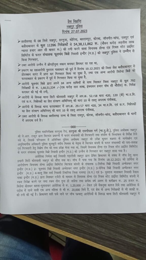 छत्तीसगढ़ के 08 जिले जशपुर, सरगुजा, कोरिया, बलरामपुर, कोरबा, जांजगीर-चांपा, रायपुर एवं बलौदाबाजार के कुल 11396 निवेशकों से 54,38,11,862 रू. (चौवन करोड़ अड़तीस लाख ग्यारह हजार आठ सौ बासठ रू.) की ठगी करने वाला विनायक होम्स एंड रियल स्टेट प्राईवेट लिमिटेड के फरार संचालक फूलचंद बिशे निवासी इन्दौर (म.प्र.) को जशपुर पुलिस ने उज्जैन से किया गिरफ्तार,