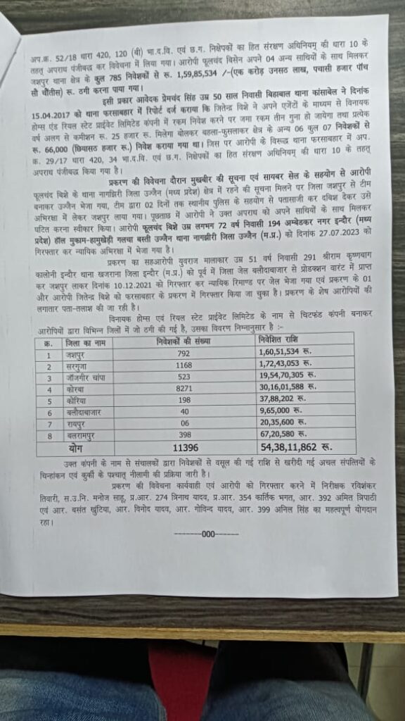 आवेदिका निर्मला बाई निवासी गढ़ाटोली जशपुर द्वारा प्रेषित शिकायत के संबंध में जांच हेतु थाना प्रभारी सिटी कोतवाली जशपुर को सौंपा गया था। जांच में पाया गया कि दिनांक 18.12.2021 को प्रार्थिया से आरोपीगण विनायक होम्स प्राईवेट लिमिटेड चिटफंड कंपनी के संचालक 1-जितेन्द्र विशे निवासी अम्बेडकर नगर इन्दौर (म.प्र.) 2- फूलचंद विशे निवासी अम्बेडकर नगर इन्दौर (म.प्र.) 3- योगेन्द्र विशे निवासी अम्बेडकर नगर इन्दौर (म.प्र.) 4-कालू सिंह वर्मा निवासी टिकरिया जिला रायगढ़ (छ.ग.) एवं 5- युवराज मालाकार निवासी देवास नाका इन्दौर (म.प्र.) द्वारा मिलकर एजेंटो के माध्यम से विनायक होम्स एंड रियल स्टेट प्राईवेट लिमिटेड कंपनी में रकम निवेश करने पर जमा रकम तीन गुना हो जायेगा तथा प्रत्येक वर्ष अलग से कमीशन रू. 25 हजार रू. मिलेगा बोलकर बहला-फुसलाकर अवेदिका से रु. 1,20,000/- लेकर उसे चेकनुमा कागज दिये तथा आवेदिका के पड़ोस में रहने वाली एक अन्य महिला से भी स. 20,000 लिये हैं, एवं क्षेत्र के अन्य निवेशकों से भी लाखो रू. की ठगी की गई है। शिकायत सही पाये जाने पर जाँच पश्चात् आरोपियों के विरूद्ध थाना सिटी कोतवाली जशपुर में अप.क्र. 52/18 धारा 420, 120 (बी) भा.द.वि. एवं छ.ग. निक्षेपकों का हित संरक्षण अधिनियम की धारा 10 के