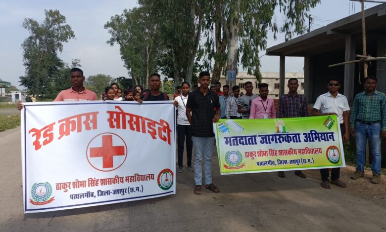 ठाकुर शोभा सिंह शासकीय महाविद्यालय पत्थलगांव की रेड क्रॉस सोसायटी इकाई के तत्वावधान में एक दिवसीय मतदाता जागरूकता अभियान का आयोजन किया गया। गौरतलब है कि वर्तमान वर्ष चुनावी वर्ष है , भारत जैसे लोकतंत्रीय देश में चुनाव का अहं महत्व होता है , इसलिए चुनाव में भाग लेने वाले मतदाताओं को जागरूक करने के वास्ते निर्वाचन आयोग द्वारा स्वीप कार्यक्रम चलाये जा रहे हैं। इसके अनुसार सरकारी संस्थाओं के माध्यम से गांव , नगर , कस्बा, एवं सार्वजनिक स्थानों में नुक्कड़- नाटक , रैली, एवं प्रदर्शनी का आयोजन करके निष्पक्ष एवं निर्भिक मतदान करने हेतु मतदाताओं को जागरूक किया जा रहा है। इसी क्रम में महाविद्यालय के प्राचार्य डॉ. बी. के. राय के मार्गदर्शन एवं रेडक्रास सोसायटी के प्रभारी प्रो. विक्रांत मोदी के नेतृत्व में छात्र छात्राओं द्वारा रैली की शक्ल में ग्राम पंचायत पालीडीह में घर-घर जाकर मतदाताओं को जागरूक किया गया। इस अवसर पर प्रो. जे.के. भगत , अतिथि प्राध्यापक संजय बघेल, संजय श्रीवास, नीलम मण्डावी , हुमी सिह, सुनिता पटेल , अल्पना कुजूर ‘ दीपिका सर्पराज उपस्थित रहे।
