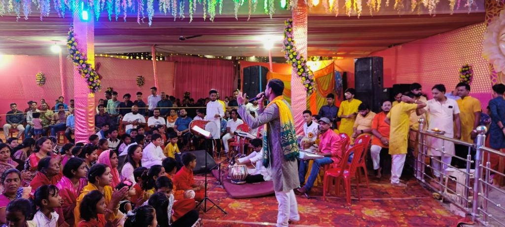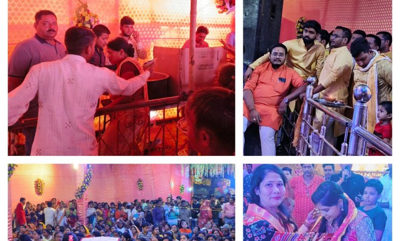 माता जगत जननी की आराधना के लिए पूरा पत्थलगांव नगर माता के जस गीतों एवं माता के ज्योत कलश जगमग हो रहा है वही सुबह शाम माता के पांडाल स्थल पर भक्तों की भीड़ का रेला उमड़ रहा है। बाजार पर दुर्गा उत्सव समिति द्वारा पंचमी के पावन मौके पर कोतबा से पधारे सुमित शर्मा की टीम के साथ उनके द्वारा पूरी रात माता के भजनों को सुनाते हुए श्रद्धालु झूमते गाते नजर आए। माता के भजनों के साथ भोले बाबा, हनुमान जी के भजन भी श्रद्धालुओं को ताली बजाने के साथ नाचने के लिए मजबूर कर दिया ।सुमित शर्मा द्वारा “आमा पान के पतरी “करेला पान के दोना” छत्तीसगढ़ी भजन से श्रद्धालुओं का मन जीत लिया ।बच्चे, युवा ,बालक, बालिका, महिलाओं के साथ समिति के सभी सदस्य नाचते गाते झूमते पूरी रात जगराता का आनंद लेते रहे ।जगराता के लिए बाजार पर दुर्गा समिति के कालू मधुबन, मुकेश प्लाईवुड ,अजय पार्षद ,सुनील पार्षद ,प्रदीप ठाकुर ,दीनू मधुबन, टिंकू सामंत ,सुनील गुप्ता, टैंको साहू सहित सभी सदस्य पूरी जगराता की कमान संभालते हुए श्रद्धालुओं के लिए पानी से लेकर बैठक व्यवस्था का ख्याल रखा गया।