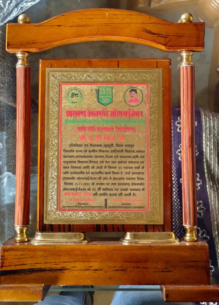 कुनकुरी विधायक यूडी मिंज जी के प्रथम कार्यकाल में ही ना केवल हमारे छत्तीसगढ़ राज्य बल्कि अन्य राज्य झारखंड एवम विदेशो में भी इनके कार्यों की चर्चाएं हैं,झारखंड स्थापना दिवस के अवसर पर दिनांक 15.11.2023 को झारखंड डेवलपमेंट ओर्गनाइजेसन की ओर से 25 वी वर्षगांठ पर झारखंड रत्न की उपाधि प्रदान के गई