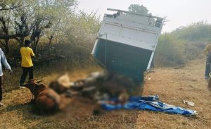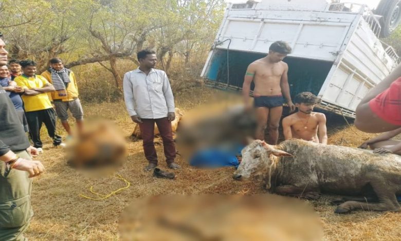 तेज रफ्तार पिकअप के पलटने से मवेशियों की मौत, तस्कर भी घायल