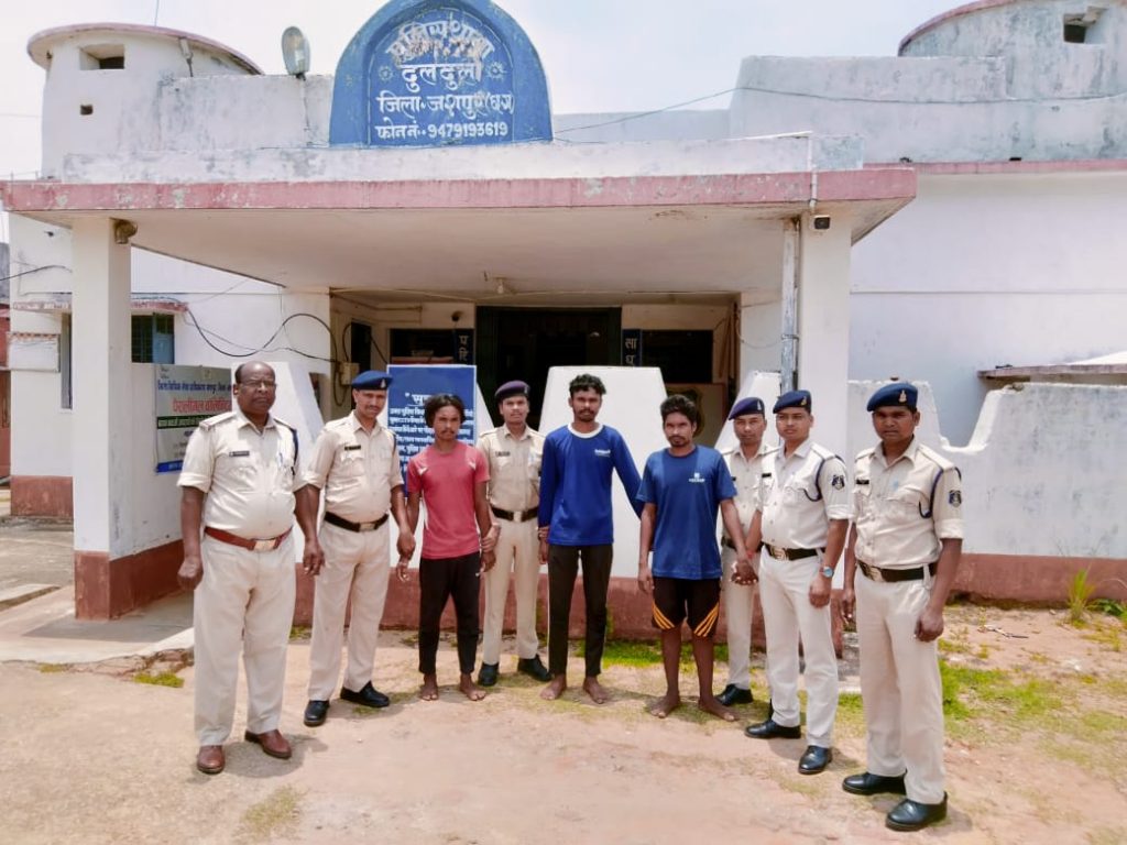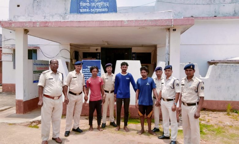 मामले में गंभीरता को देखते हुये पुलिस अधीक्षक जशपुर शशि मोहन सिंह के निर्देशानुसार उनकी स्पेशल टीम ने चंद घंटे में पतासाजी कर आरोपीगण 1-रसल कुजूर उम्र 24 साल 2-निशुल तिर्की उम्र 18 साल 11 माह, 3-रितेश कुजूर उम्र 20 साल सभी निवासी निवासी सरईटोली एवं दिनांक 28.05.2024 को गिरफ्तार कर न्यायिक अभिरक्षा में भेजा गया है, घटना में सम्मिलित शेष 03 अपचारी बालक उम्र सभी लगभग 17 वर्ष से घटना के संबंध में पूछताछ उपरांत उन्हें बाल संप्रेषण गृह भेजा गया।