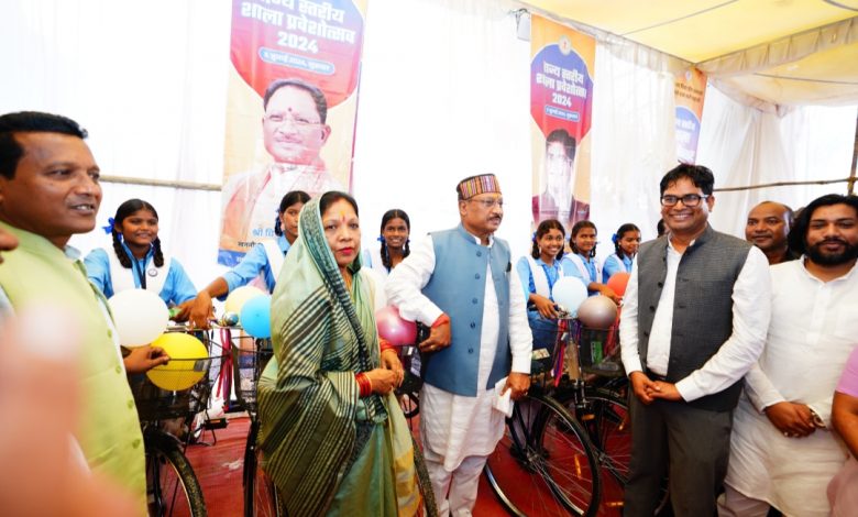 जशपुर जिले के ग्राम बगिया में आयोजित राज्य स्तरीय शाला प्रवेश उत्सव के अवसर पर आज यहां छात्र छात्राओं के लिए खुशियों भरा दिन रहा। जहां एक ओर कार्यक्रम में बतौर मुख्य अतिथि प्रदेश के मुखिया और जशपुर के माटी पुत्र मुख्यमंत्री विष्णुदेव साय कार्यक्रम में शामिल हुए। वही दूसरी तरफ शाला प्रवेशोत्सव में नव प्रवेशी बच्चों के अभिनंदन के साथ उन्हें उपहार देने के साथ ही मुख्यमंत्री श्री साय ने 9 वीं कक्षा में प्रवेशित छात्राओं को निःशुल्क साइकिल का वितरण किया। छात्राओं ने साइकिल मिलने की खुशी सामूहिक रूप से साइकिल की घंटी बजाकर जाहिर की और मुख्यमंत्री साय का आभार जताया।