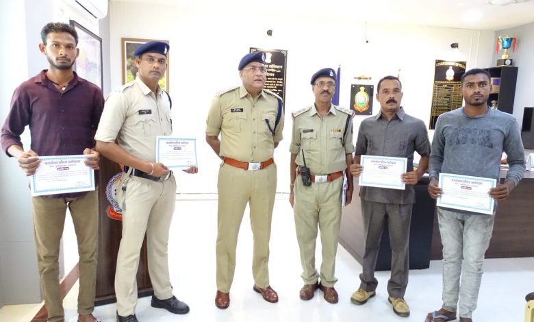 पुलिस अधीक्षक विजय अग्रवाल द्वारा प्रशंसनीय एवं उत्कृष्ट कार्य करने वाले कुल 22 पुलिस अधिकारी कर्मचारियों एवं पुलिस की सहायता करने वाले तीन गुड सेमीरिटन को किया गया सम्मानित थाना लवन क्षेत्र अंतर्गत ग्राम भालूकोना में घटित दो महिलाओं के नृशंस हत्या करने वाले आरोपी को गिरफ्तार करने वाली टीम ,ग्राम गिधौरी में अवैध मादक पदार्थ गांजा की तस्करी आरोपी को गिरफ्तार करने वाली टीम,स्थाई वारंटो की तामीली करने वाली टीम सम्मानित